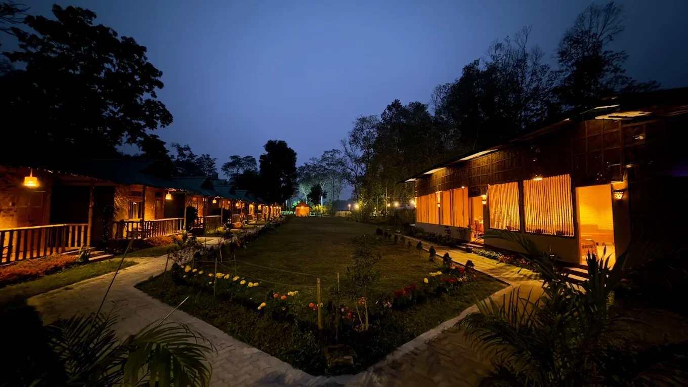Sits on the edge of Kaziranga National Park in traditional-style cottages. You’re deep in tea-country-meets-grassland territory, no town walking, no nearby cafes.